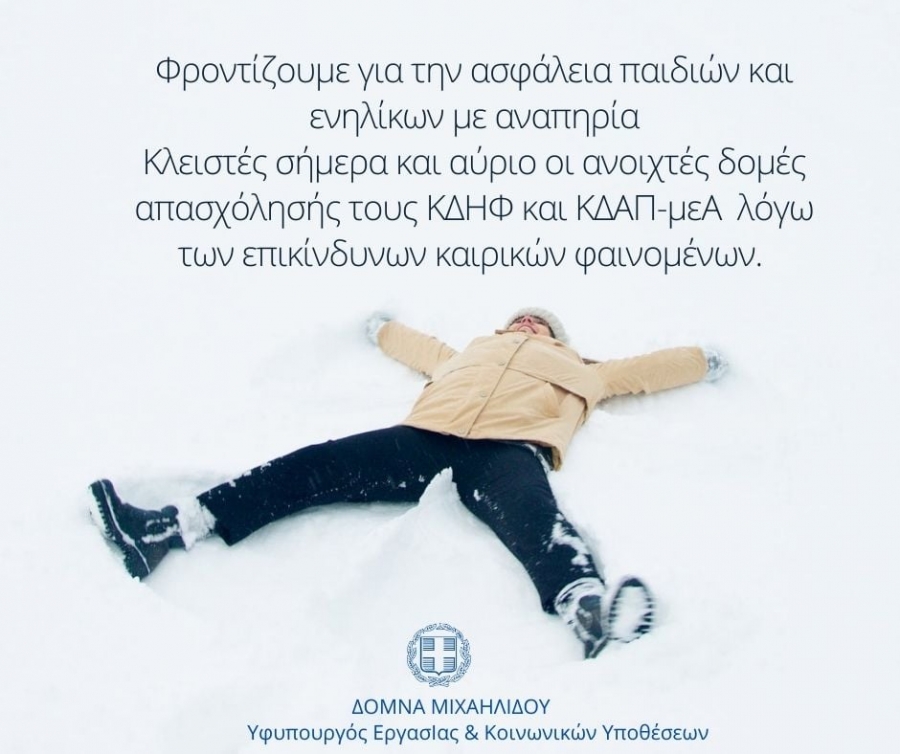 Με στόχο την προστασία και τη διασφάλιση της υγείας τόσο των ωφελούμενων όσο και των εργαζόμενων, αποφασίσαμε να παραμείνουν κλειστά τα ΚΔΑΠμεΑ και τα ΚΔΗΦ σήμερα 15.02.2021 και αύριο 16.02.2021 λόγω της έντονης κακοκαιρίας (χιονόπτωσης και παγετού) στις περιφέρειες: