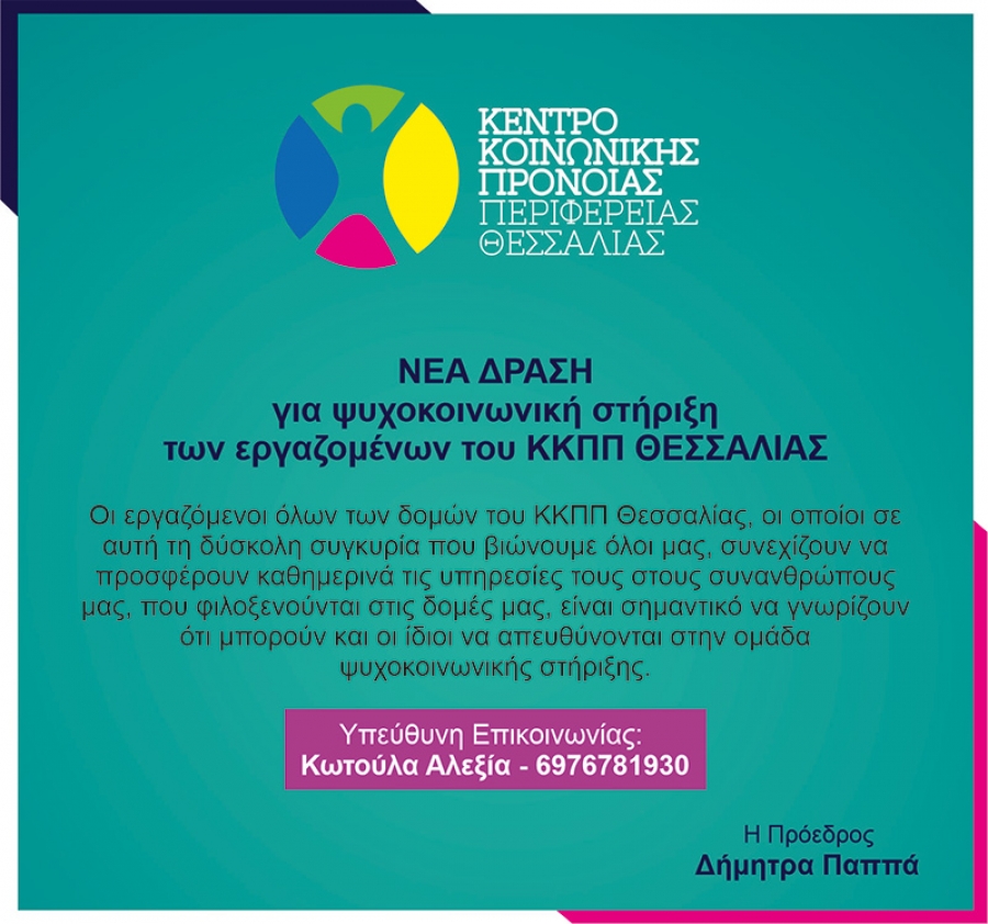 Νέα δράση για ψυχοκοινωνική στήριξη των εργαζομένων του ΚΚΠΠ ΘΕΣΣΑΛΙΑΣ