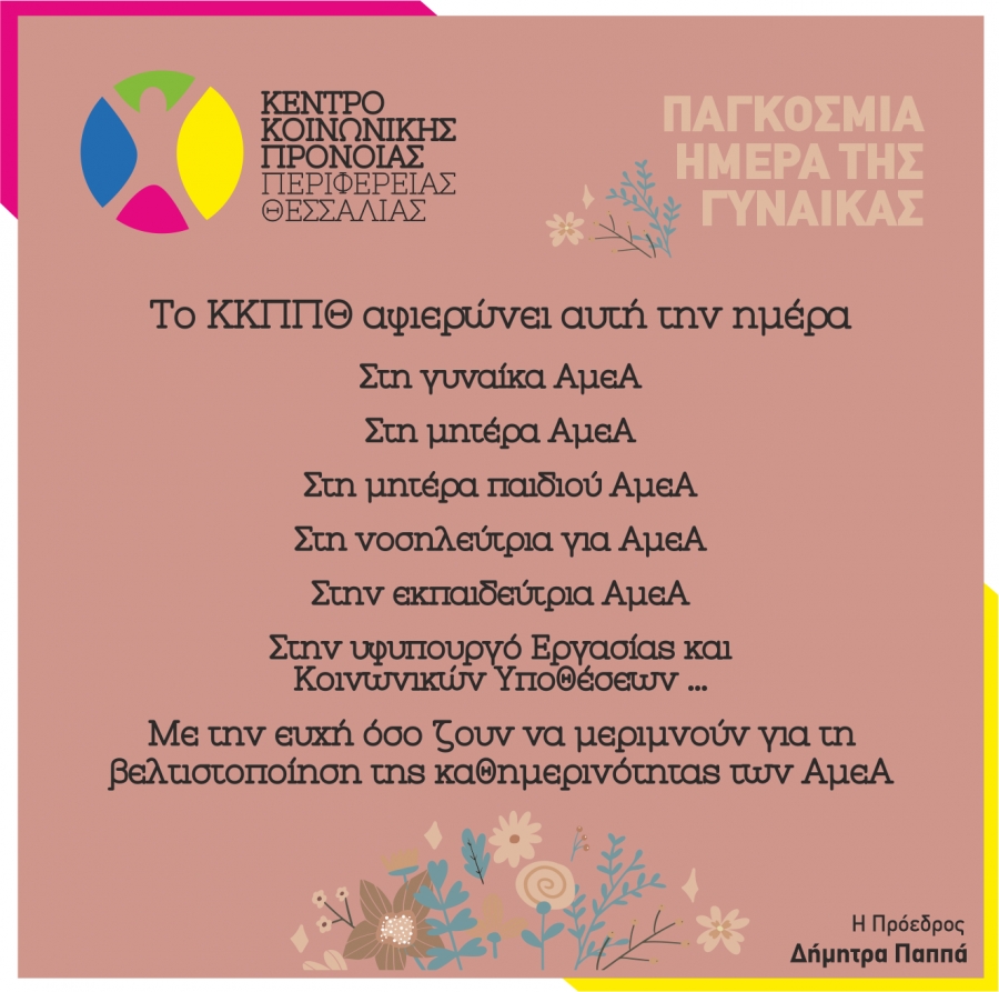 Το ΚΚΠΠΘ αφιερώνει αυτή την ημέρα Στη γυναίκα ΑμεΑ Στη μητέρα ΑμεΑ Στη μητέρα παιδιού ΑμεΑ Στη νοσηλεύτρια για ΑμεΑ
