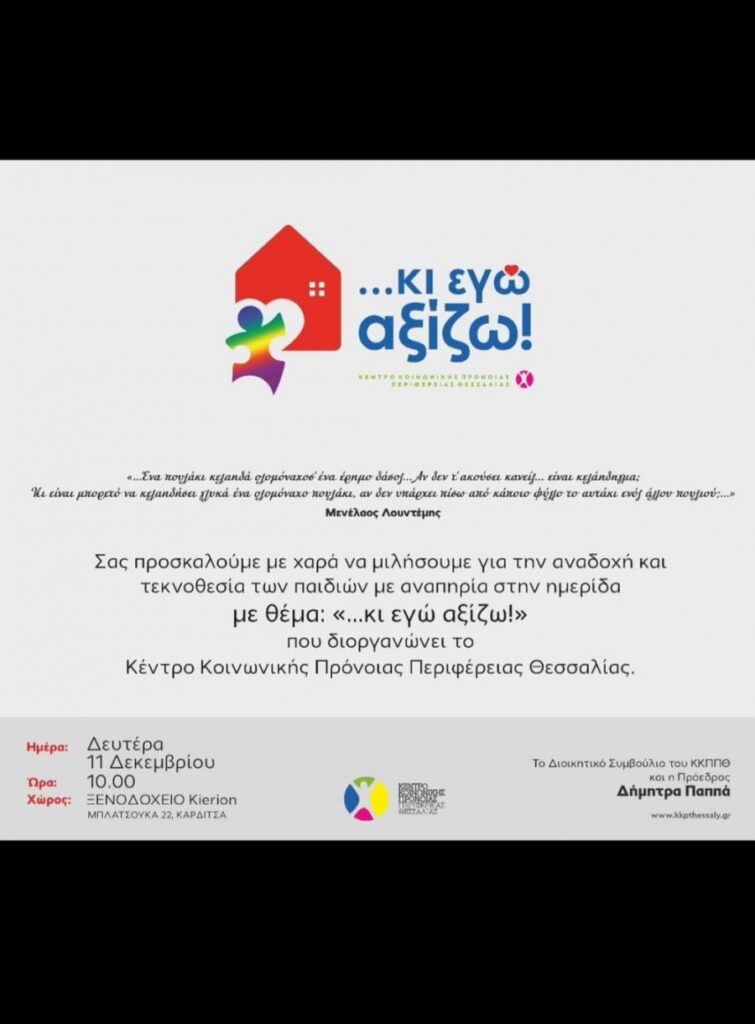 Υπό την Αιγίδα του Υπουργείου Κοινωνικής Συνοχής και Οικογένειας πραγματοποιούμε στην Καρδιτσα ημερίδα με θέμα “κι εγω αξιζω”.